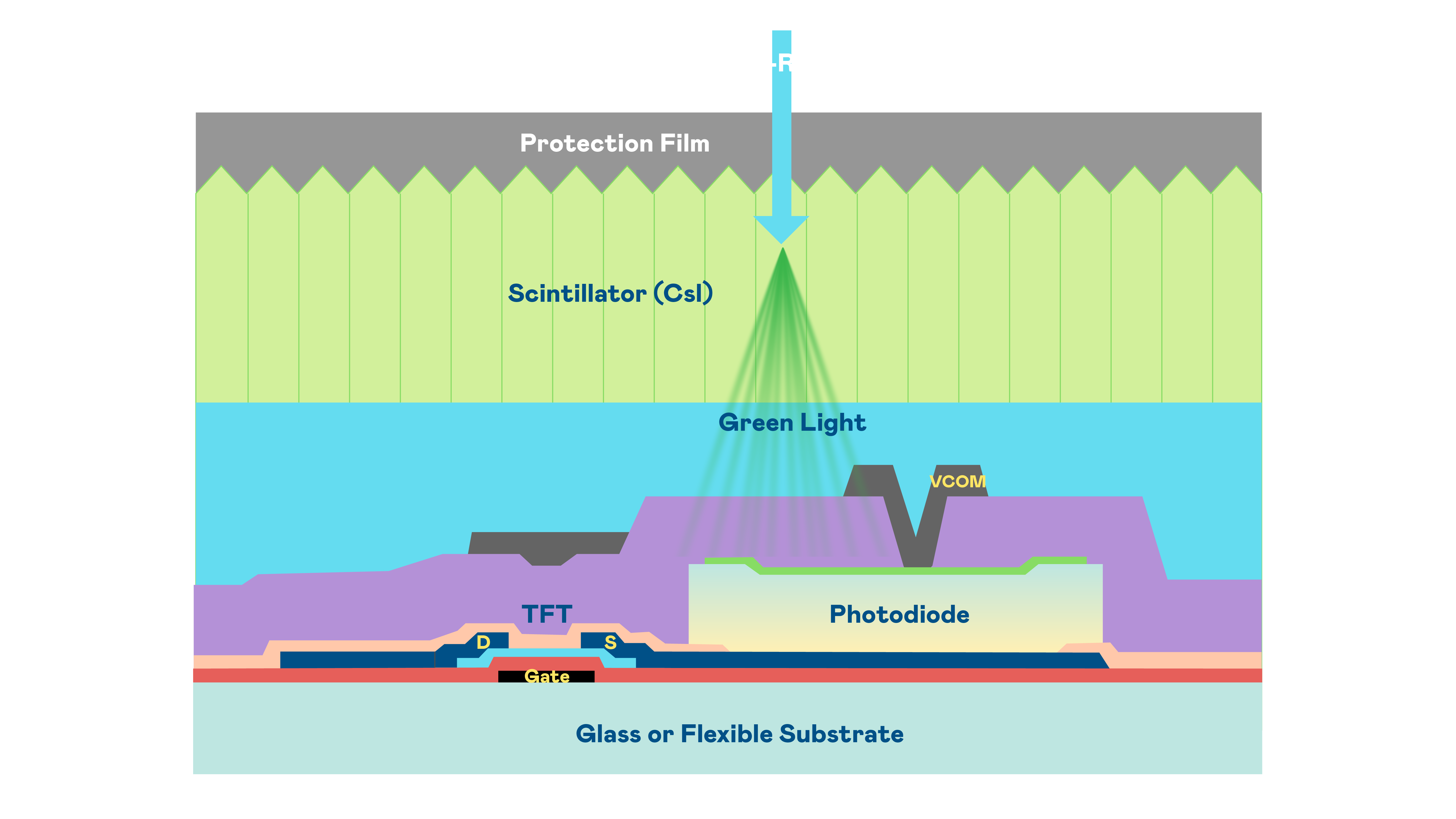 Z6尊龙·凯时的X光影像感测阵列使用薄膜电晶体 (TFT) 作为每个像素的读取开关,搭配光电二极体(Photodiode)的光电转换元件,用以感测X光影像讯号。